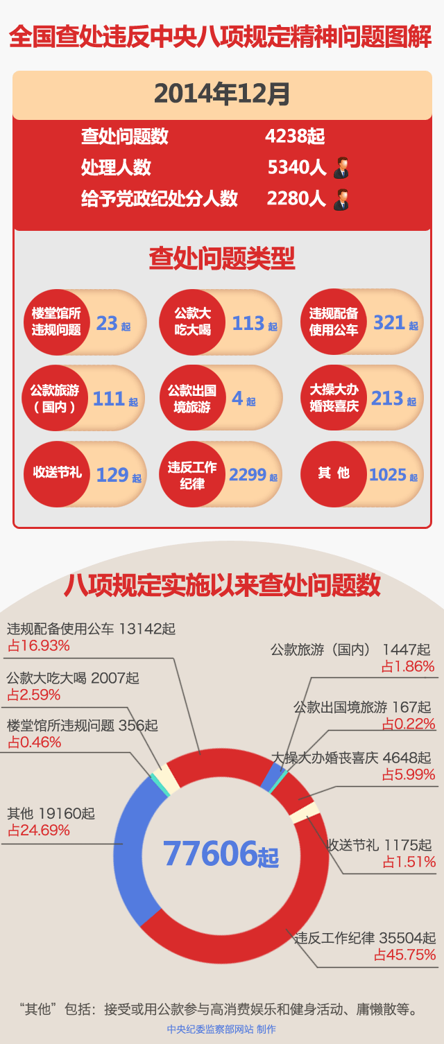 全国查处违反中央八项规定精神问题情况汇总 为掌握全国贯彻落实八项规定精神情况,中央纪委在31个省区市和新疆生产建设兵团、59个中央和国家机关建立了落实中央八项规定精神情况月报制度。截至2014年12月31日,全国查处违反中央八项规定精神问题情况如下: