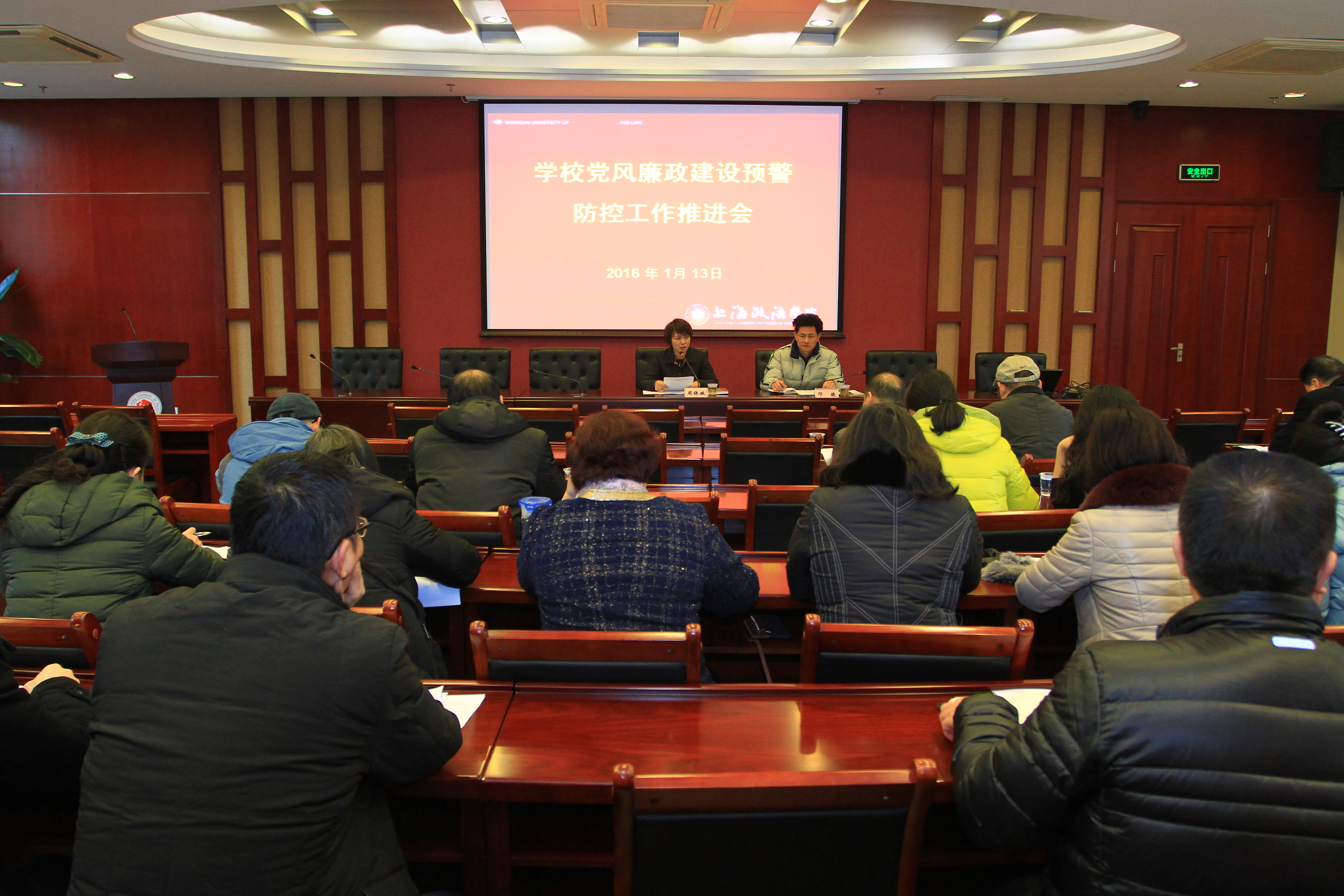 2016年1月13日上午9:00,学校在校部楼107会议室组织召开党风廉政建设预警防控工作推进会。会议由学校党委副书记、副校长周银娥同志主持。各二级学院党总支书记(负责人)、二级学院院长、各职能部门主要负责人参加了会议。