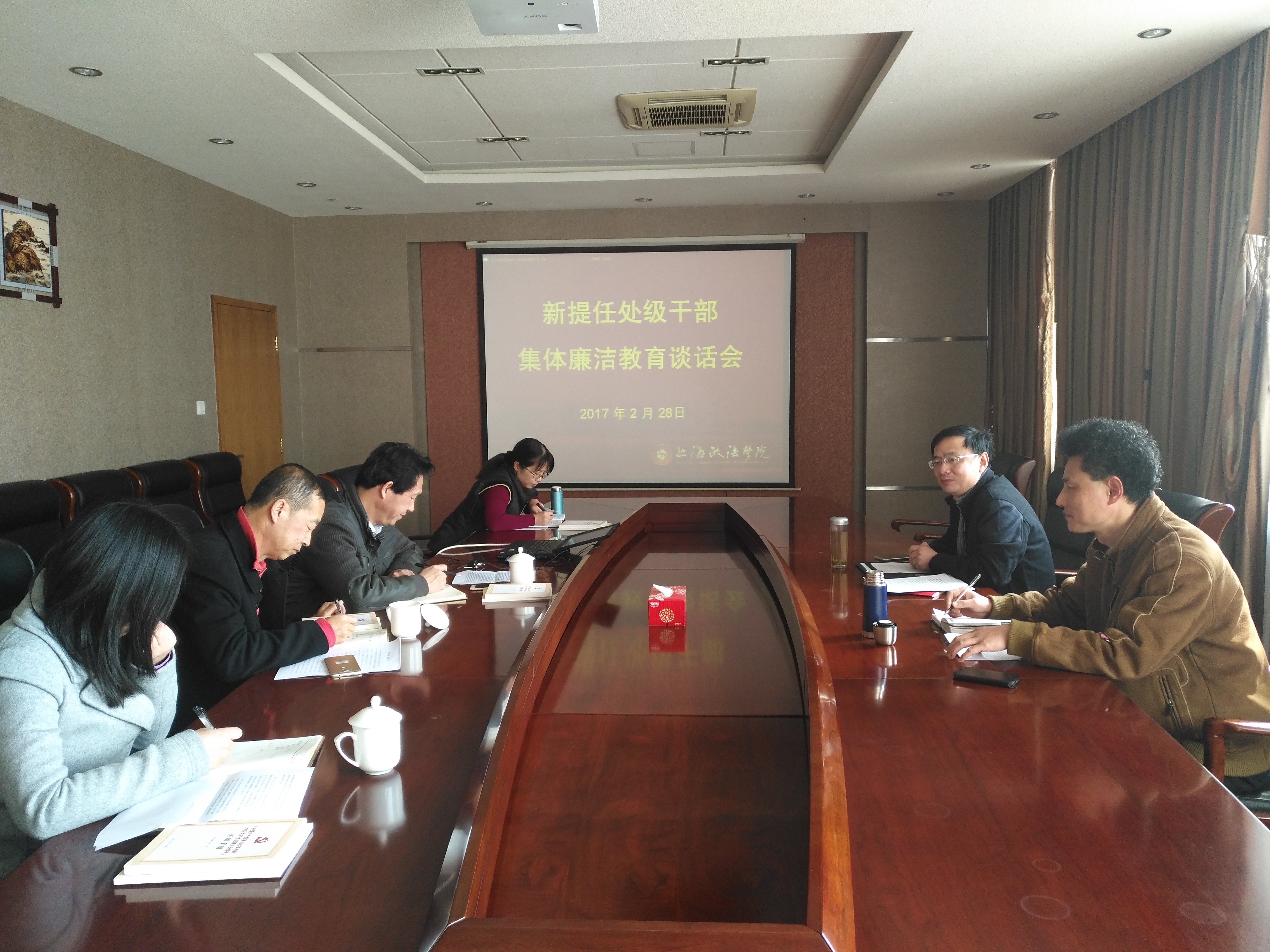 2月28日,校党委副书记、纪委书记吴强对我校近期提任处级干部进行了集体廉政谈话。纪委副书记、监察室主任邓骏主持了谈话会。参加廉政谈话的新提任干部是人事处处长韩同兰、教务处处长袁胜育、国际经济法学院副院长王祥修、外国语学院副院长夏甘霖。