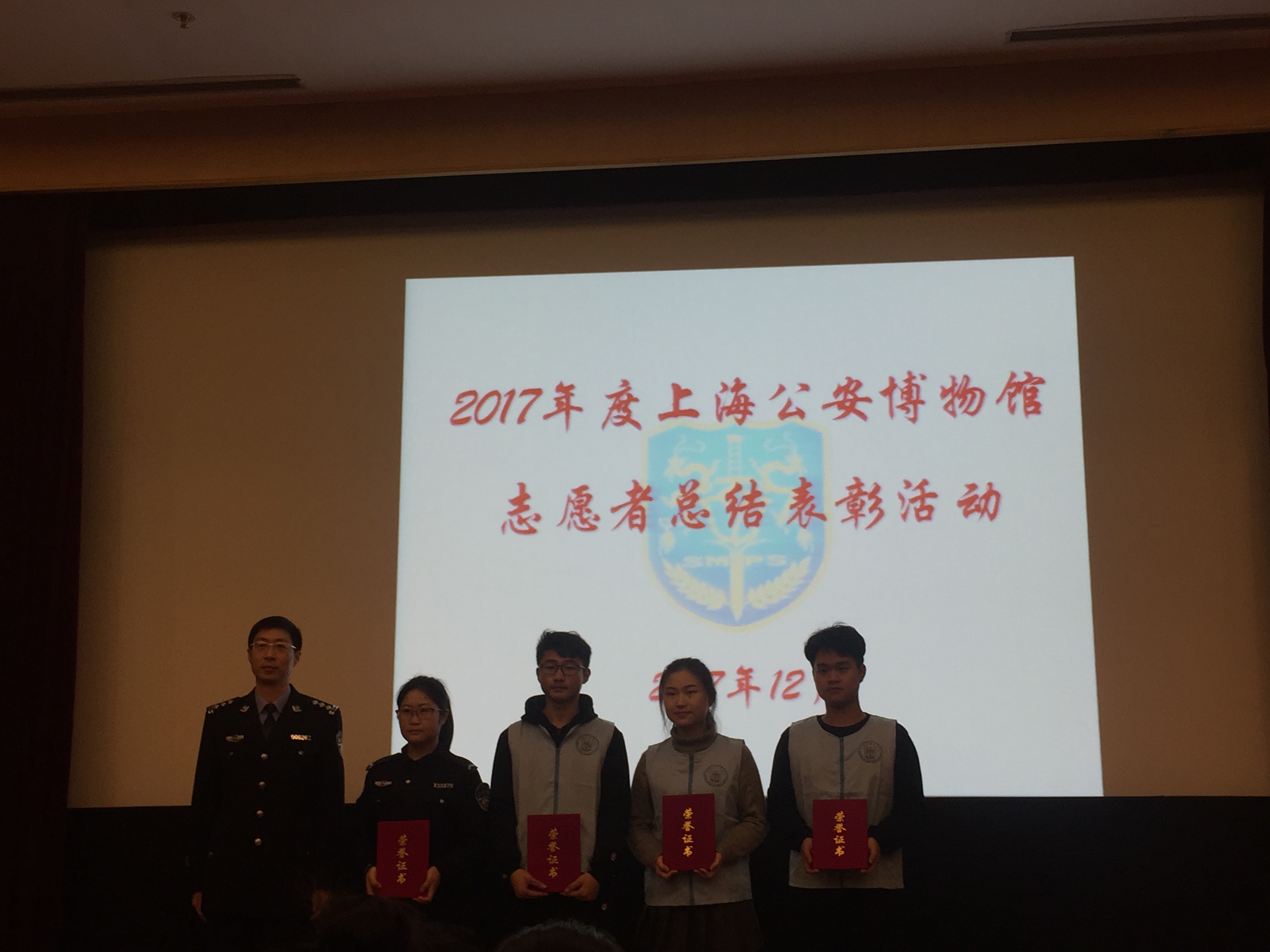 2017年12月8日,上海公安博物馆举办2017年度志愿者总结表彰活动,由新利18官方客服警务学院政法干警班第一学生党支部党员和警务化办公室志愿者部组成的蓝盾志愿者团队应邀参加,并授予“优秀志愿服务团队”称号。