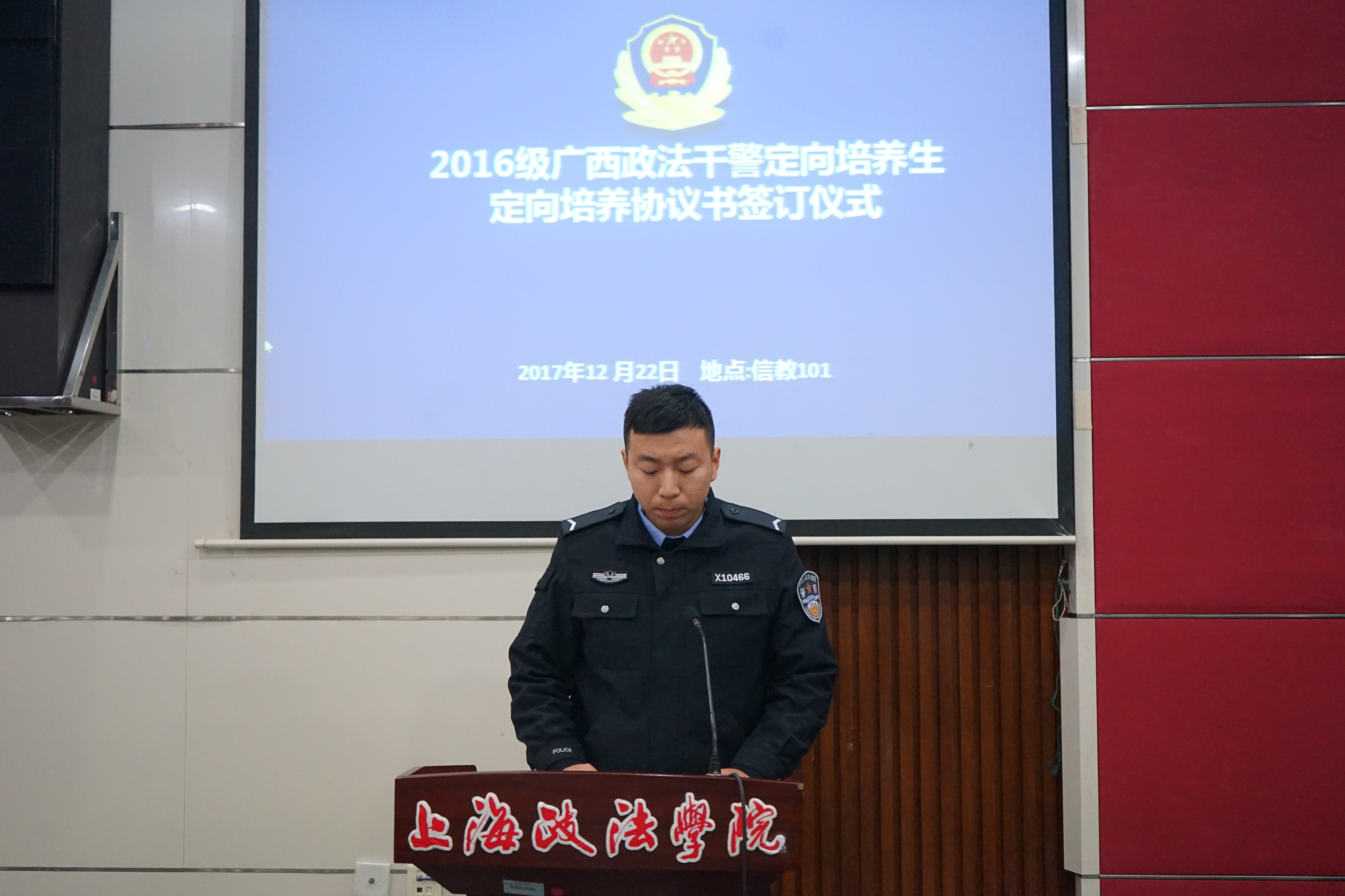 签约仪式之前,各位领导与学员们共同观看了新利18官方客服政法干警学员风采视频,该视频充分展现了我校政法干警学员良好的精神风貌和严肃的纪律作风。徐海琨对远道而来的广西司法行政系统领导们表示了感谢,同时向他们汇报了2016级广西政法干警学员在校的表现情况,介绍了学校的培养计划和教学模式,就改进培养教学方法进行了探讨。徐海琨提到,2016级广西政法干警学员在校表现十分优异,在多次代表学校参加的市级、国家级比赛中担当主力并取得了出色的成绩,对广西学员们的辛苦付出表示了感谢。随后,干警学员代表胡孝文上台发言。胡孝文谈到了入校以来在政法干警试点班学习的感受和收获,并号召学员们继续努力学习,为明年步入工作岗位打下扎实的基础。
