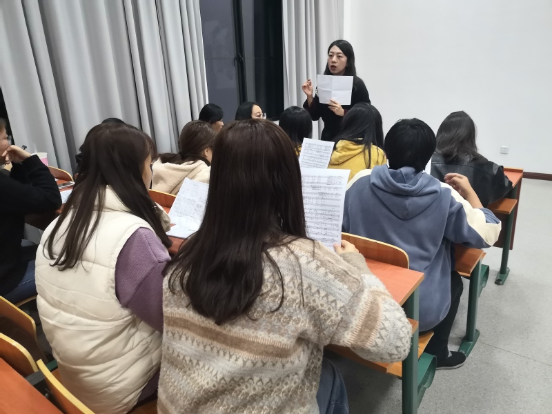 接下来,张亚鑫对合唱团的排练曲目《今天是你的生日,我的中国》进行了细致的指导。这是一首曲调比较平缓的合唱歌曲,表达了歌唱者对祖国的祝福之情,声音纯美动听,有着丰富的情感色彩。因为生疏,一开始同学们唱起来还很有难度,在张亚鑫老师的指引下,同学们的发音逐渐准确,演唱更是逐渐变得张弛有度,收放自如。