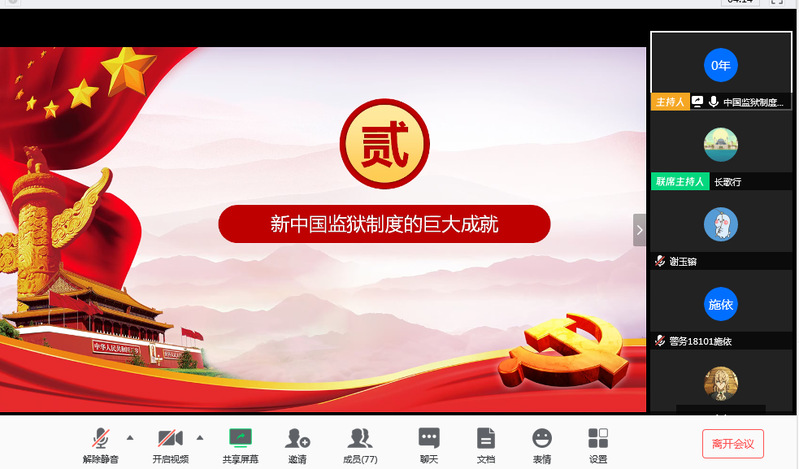 为丰富“四史”学习教育活动形式,激发广大党员群众学“四史”的热情,526日下午,警务学院教工党支部和上政第24学生支部以举办线上讲座的形式联合开展“从历史中汲取精神力量、汲取经验智慧、汲取坚守人民立场的定力,为奋力夺取疫情防控和实现经济社会发展目标双胜利提供强大思想保障”主题党日活动。邀请警务学院退休党员贾洛川教授开展“新中国监狱制度70年的伟大历程、巨大成就和发展完善”主题讲座。警务学院全体党员和积极分子聆听了本次讲座。讲座由警务学院党总支书记马小娜主持。