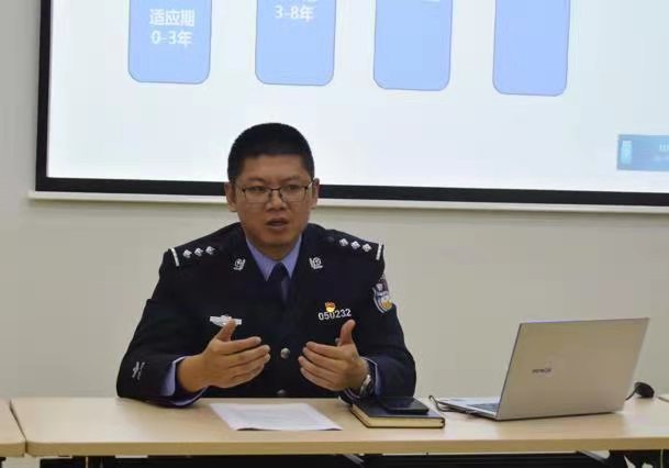 郑正警官从警10余年,经历了特警、机关等多个公安岗位,他以丰富的从警经验,信手拈来的警情案例,生动形象的警务语言,向在场的同学们详细地介绍了警察职业的艰辛与荣光。在从警职业规划方面,郑警官将职业生涯分为“三年适应期的身份转变”、“八年成长期的自我定位”、“成熟期的稳定保持”以及“职业最后五年培养新人”四个阶段,给未来警务学子的工作指明了职业方向。在自我认知方面,郑警官言简意赅表达了认识自己即为“知仁者智,自知者明”的观点,要对自我的特长有清晰的认知,在警察职业中具体的表现是:拥有自豪感、荣誉感、集体认同感等积极思想,切忌自视过强和自视过低的消极心理。