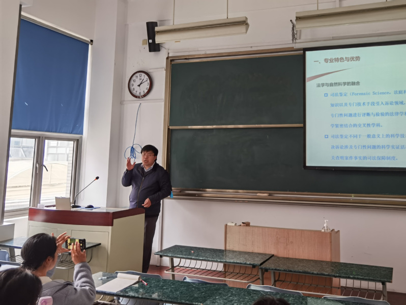 沈臻懿首先从“专业特色与优势”、“专业与职业衔接”两个板块展开,内容涉及“司法鉴定中科学技术与专门知识的应用”、“司法鉴定的法律属性”、“司法鉴定(法庭科学)专业学生可以从事的职业选择方向”等多个方面,尤其是对学生不甚了解的司法鉴定的四个大类“法医类”、“物证类”、“声像资料鉴定”、“环境损害司法鉴定”进行了详尽阐述并结合现实进行了具体分析。而后,沈臻懿又对同学们关于司法鉴定(法庭科学)的相关问题做出解答,讲述通俗易懂,深入浅出,学生们听得饶有趣味,掌声一浪高过一浪。