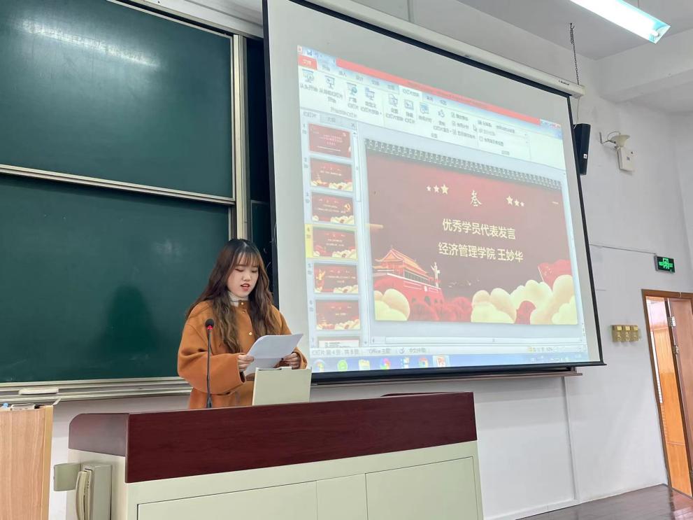 经济管理学院王妙华同学作为优秀学员代表进行发言。她表示,通过本次培训班的学习,深刻认识了党的理论知识,明确了一个大学生党员的时代责任,要坚定自己的信念,传承红色精神与建党精神,将自己的人生和民族的命运紧密联系在一起,并在未来继续努力,真正成为一名合格的共产党员。