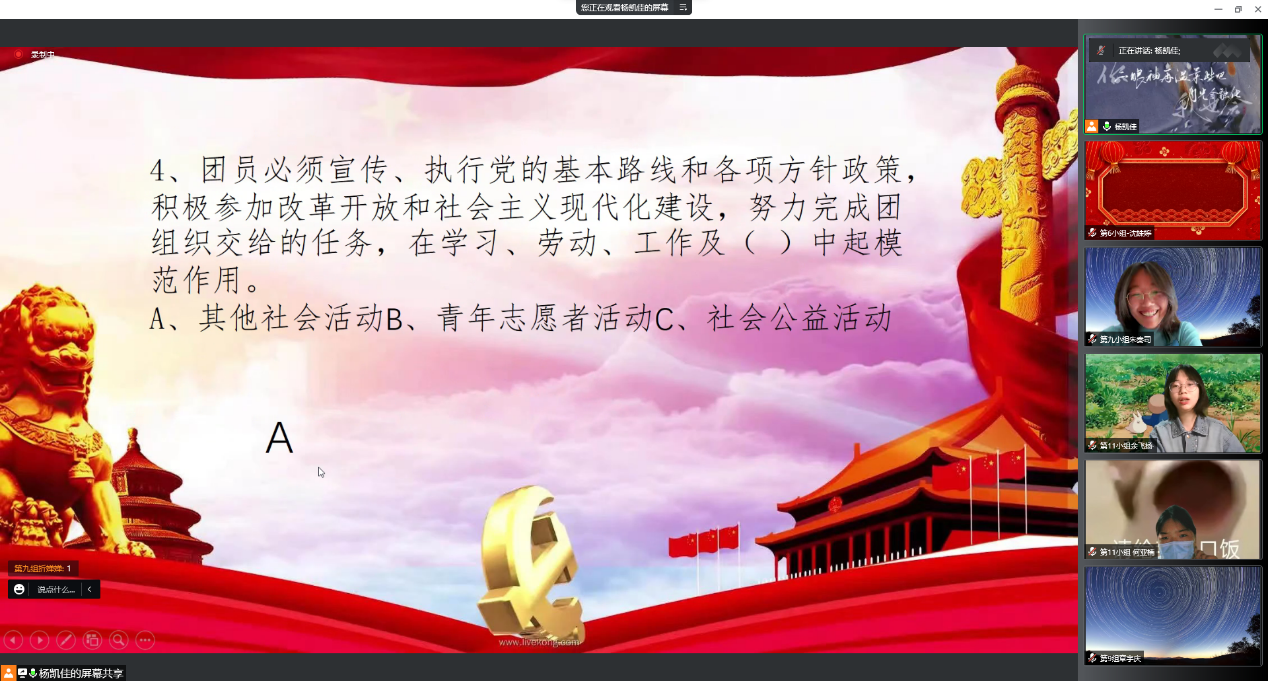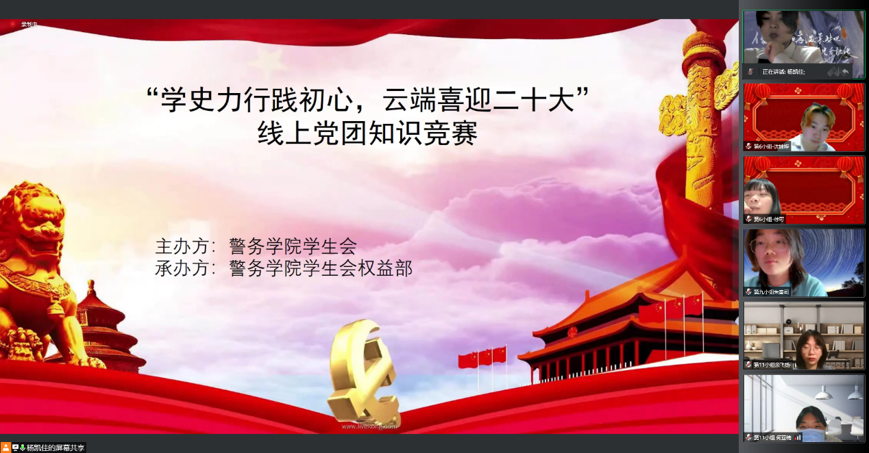 为倡导警务学子积极学习党团知识,激发同学们在疫情期间的学习热情,引领广大同学汲取红色营养、提升政治站位。4月24日下午,警务学院“学史力行践初心,云端喜迎二十大”知识竞赛于腾讯会议上顺利举行。