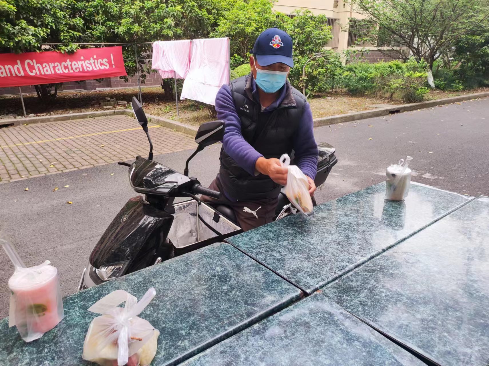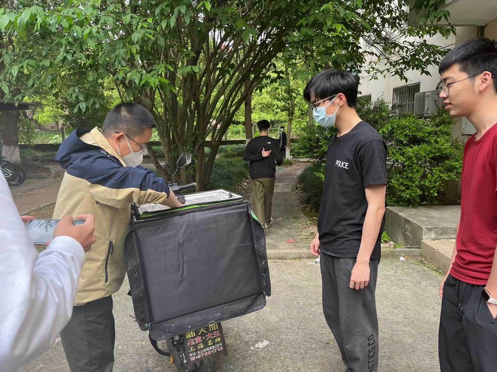 落实封控管理的空荡校园内,随处可见骑手们辛劳的身影。老师们各自分工,实现线上订餐与线下送餐的有序对接,送餐前根据订单地址编号,将打包好的餐品逐一扫码录入信息,排列在配送保温箱内,然后化身“外卖天团”,骑着电瓶车穿梭于各栋宿舍楼之间,准确无误送达各楼指定外卖存放点。