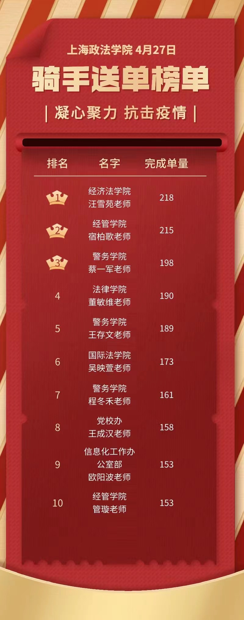 4月27日的16:10到18:56,蔡一军老师、王存文老师、程冬禾老师三人荣登新利18官方客服骑手送单榜单,完成单量总计五百四十余件,在榜单上使警务学院小小“霸榜”一回。其他老师同样完美完成各订单要求,做到保证时效性的前提下,尽快送达对应地点,满足学生需求。