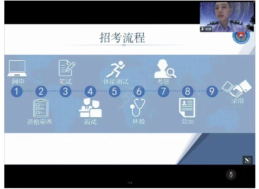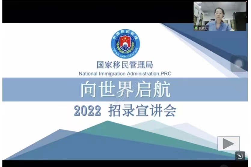李理警官首先通过视频介绍了国家出入境边防检查工作的性质和职能,并从维护国门口岸安全、抗击新冠肺炎疫情、助力复工复产和实施便民利民新举措四方面阐述边检民警的神圣使命。对移民管理警察的报考流程进行了详细解读。在互动环节,李警官耐心回答了同学们提出的问题,并给出了具体建议,鼓励同学们积极报考边检警察岗位、认真备考。