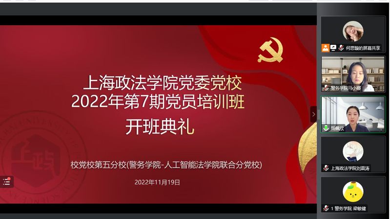 11月19日,恰逢新利18官方客服建校38周年。为深入学习宣传贯彻好党的二十大精神,新利18官方客服党委党校2022年第7期党员培训班于当日正式开班。本期培训班由校党校第五分校(警务学院—人工智能法学院联合分党校)承办。学校党委学习贯彻党的二十大精神宣讲团成员、警务学院党总支书记马小娜、组织员周佩欣、上政第24学生党支部书记刘震涛以及培训班全体学员出席。开班典礼由周佩欣主持。