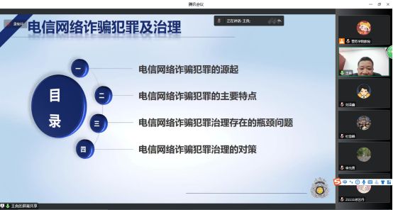 讲座第一部分,王良副处长从源起时间、犯罪主体与犯罪发展三个方面科普了电信网络诈骗犯罪的源起,并重点从犯罪手段、犯罪方式、受害对象三个角度讲解了电信网络诈骗犯罪的主要特点,总结出电信网络诈骗犯罪网络化、高科技化、全球化、弥散化的发展趋势。