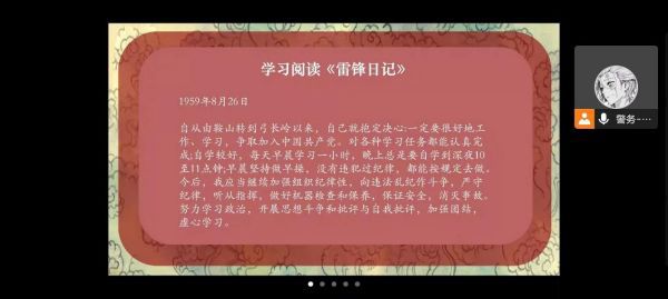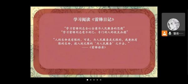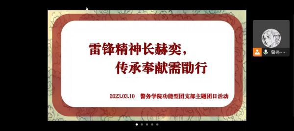 为缅怀雷锋同志,更好地学习雷锋精神,更深刻地把握雷锋精神的时代内涵,3月10日下午,警务学院功能型团支部举行警务学院“雷锋精神长赫奕,传承奉献需勖行”主题线上团日活动。本次活动由团委副书记程诗媛主持,警务学院全体团学骨干参加。