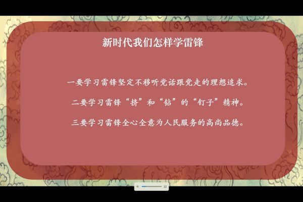 主讲人以自己的亲身经历引出开展本次团日活动的目的。她讲到今年是老一辈革命家为雷锋同志题词的60周年。1963年2月22日,毛主席用毛笔书写了“向雷锋同志学习”七个潇洒飘逸的行草字。程诗媛为大家生动地讲述了毛主席在为雷锋同志题词时的小故事,带领大家一起学习阅读的《雷锋日记》的精彩摘录,帮助同学们更好地去学习雷锋同志全心全意为人民服务的思想和毫不利己、专门利人的优良品德,有利于同学们进一步把握雷锋精神的时代内涵。