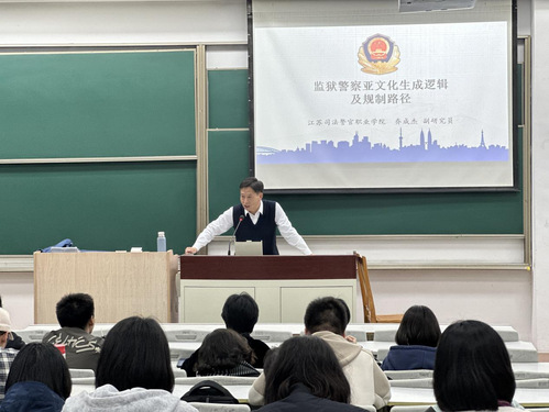 2024年11月12日晚,由警务学院(司法鉴定学院)主办的“警务讲堂”第三十二讲“监狱警察亚文化生成逻辑及规制路径”在信教108顺利举办。本次讲座由江苏省司法警官职业学院副院长、副研究员乔成杰主讲,警务学院监狱学教研室主任游艺主持。