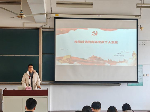 警务学院教工党支部书记冯秋迪以“内卷时代的青年党员个人发展”为主题授课。他回顾了中国共产党人的初心与使命,强调了个人成长与国家进步间不可分割的纽带,鼓励大学生党员在个人成长过程中结合自身特点和社会环境,实现自我价值和社会贡献,让个人的理想与国家的未来同频共振。