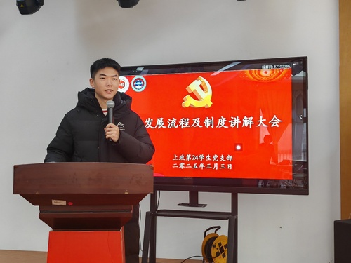 为深入学习贯彻习近平新时代中国特色社会主义思想,进一步规范党员发展工作,确保党员队伍的纯洁性和先进性,2025年3月3日中午,上政第24学生党支部在成德楼四楼多功能厅召开了党员发展流程及制度讲解大会。
