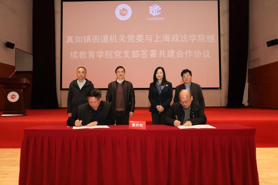 在双方领导的共同见证下,真如镇街道机关党工委书记蒋志强与我校继续教育学院党支部书记张军分别代表各自单位签署了共建合作协议。