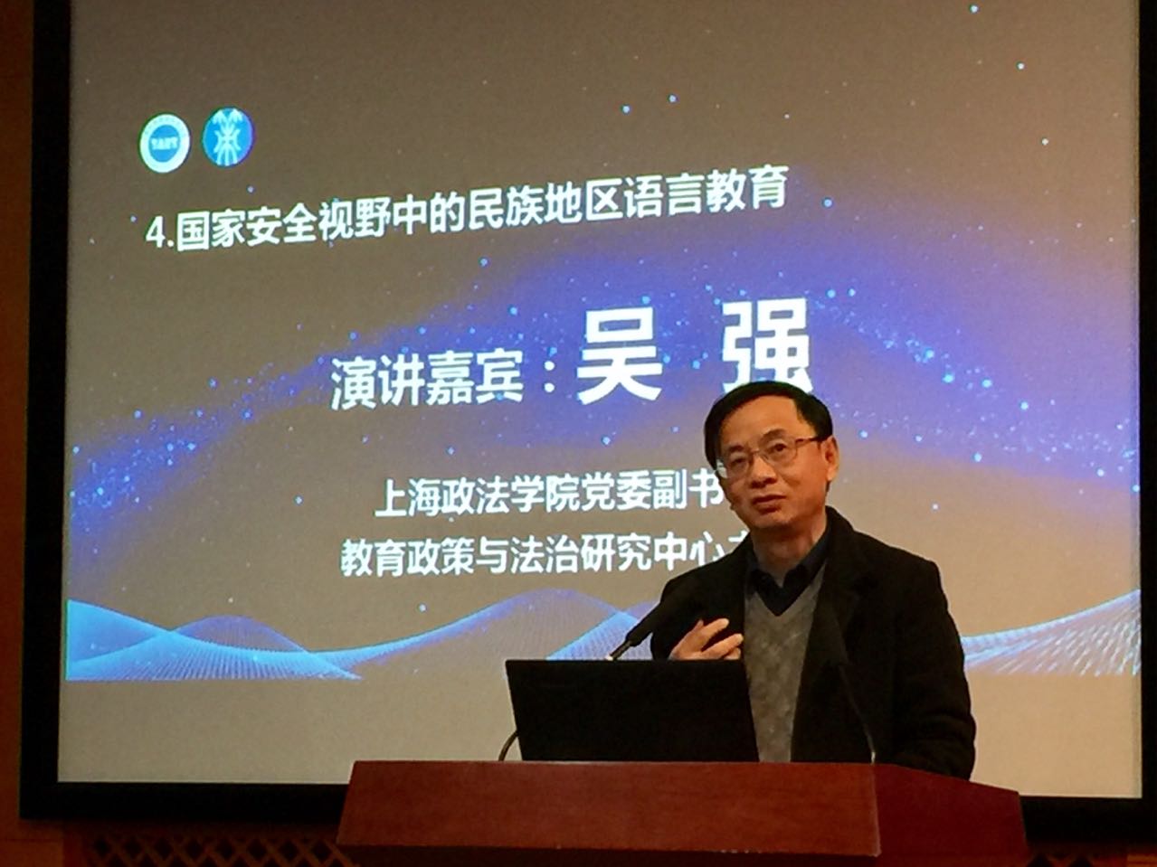 新利18官方客服党委副书记、教育政策与法治研究中心主任吴强作为国家语委“十二五”重大研究项目《国家安全中的语言战略》课题的主要负责人,做了《国家安全视野中的民族地区双语使用与教育》专题学术报告。报告结合近年来参与国家和上海重要教育政策的起草,及实地走访近十个少数民族地区调研的生动案例,分析了语言在国家安全特别是在抵御“三股势力”斗争中的特殊功能,提出语言是维系国家安全的情感纽带和实现国家利益的政治工具,是国家非传统安全的核心领域。吴强进一步提出,普及国家通用语言、构建各民族和谐语言生态、增强国家语言治理能力的五点政策建议。演讲获得了与会专家的热烈反响。论坛最后,吴强做了会议简要总结,并宣布高峰论坛圆满结束。