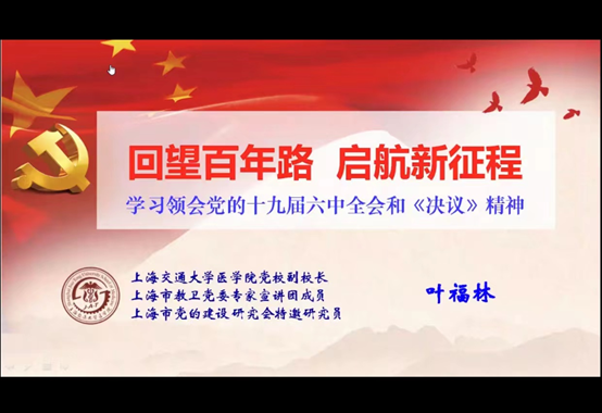 2022年3月22日,上海交通大学医学院党校副校长叶福林教授应邀参加我校“名家讲坛”第九十三讲并作线上专题讲座——“回望百年路,启航新征程——学习领会党的十九届六中全会和《决议》精神”。本次讲座由科研处主办,马克思主义学院承办,讲座由马克思主义学院党总支书记徐俊峰主持,全校100余名师生参加。