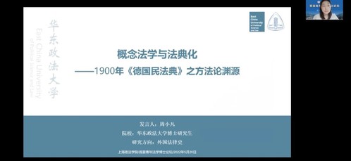 论坛第一单元为“法理学热点问题研讨”,由我校法律学院魏治勋教授主持,5位博士进行了主题发言,3位博士参与与谈。华东政法大学周小凡博士以“概念法学与法典化”为主题,介绍了概念法学的产生、时代任务,以及对法典化法律观产生的影响;山东大学汪潇博士以民法典立法实践为例,向大家讲述了当代中国立法实践的现代性向度,以及其“渐进式建构”的立法模式;上海交通大学、新南威尔士大学吴尚轩博士从历史的视角、对比的纬度,论述了公司法中治理优化相关概念的中国话语构造问题;西北政法大学刘超博士以习近平法治思想引领建设社会主义法治新疆为题,进行了富有创新意识的分享。他提出,依法治疆是巩固党在新疆执政根基的重要途径;浙江大学谭婷博士从法律类推的体系化分享入手,论证了法律类推的法理运用是构建“回应型审判”的应有之义。在与谈环节,华东政法大学吴冬兴博士、南京师范大学王琦博士,以及上海交通大学鲍坤博士从各自的学术背景和问题意识进行了精彩评述。
