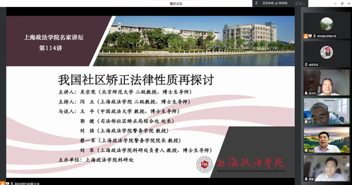 2022年9月27日晚,新利18官方客服“名家讲坛”第114讲顺利召开。北京师范大学刑事法律科学研究院二级教授、中国犯罪学学会副会长吴宗宪应邀以“我国社区矫正法律性质再探讨”为题为我校师生作了一场精彩的线上学术专题讲座。我校二级教授闫立主持本次讲坛,中国政法大学教授王平、司法部社区矫正局综合处处长郭健、我校警务学院院长蔡一军教授、刘强教授、科研处负责人刘军教授参与与谈,我校一百余名师生在线参与了本次学术讲座。