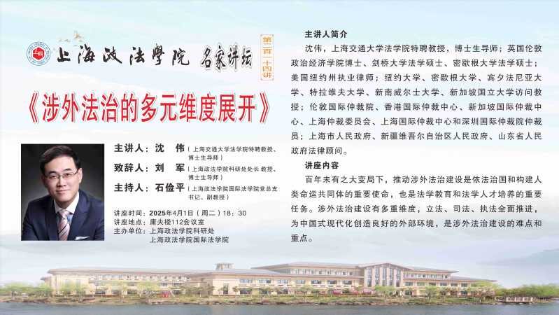【4月1日名家讲坛第214讲预告】上海交通大学法学院沈伟教授:《涉外法治的多元维度展开》