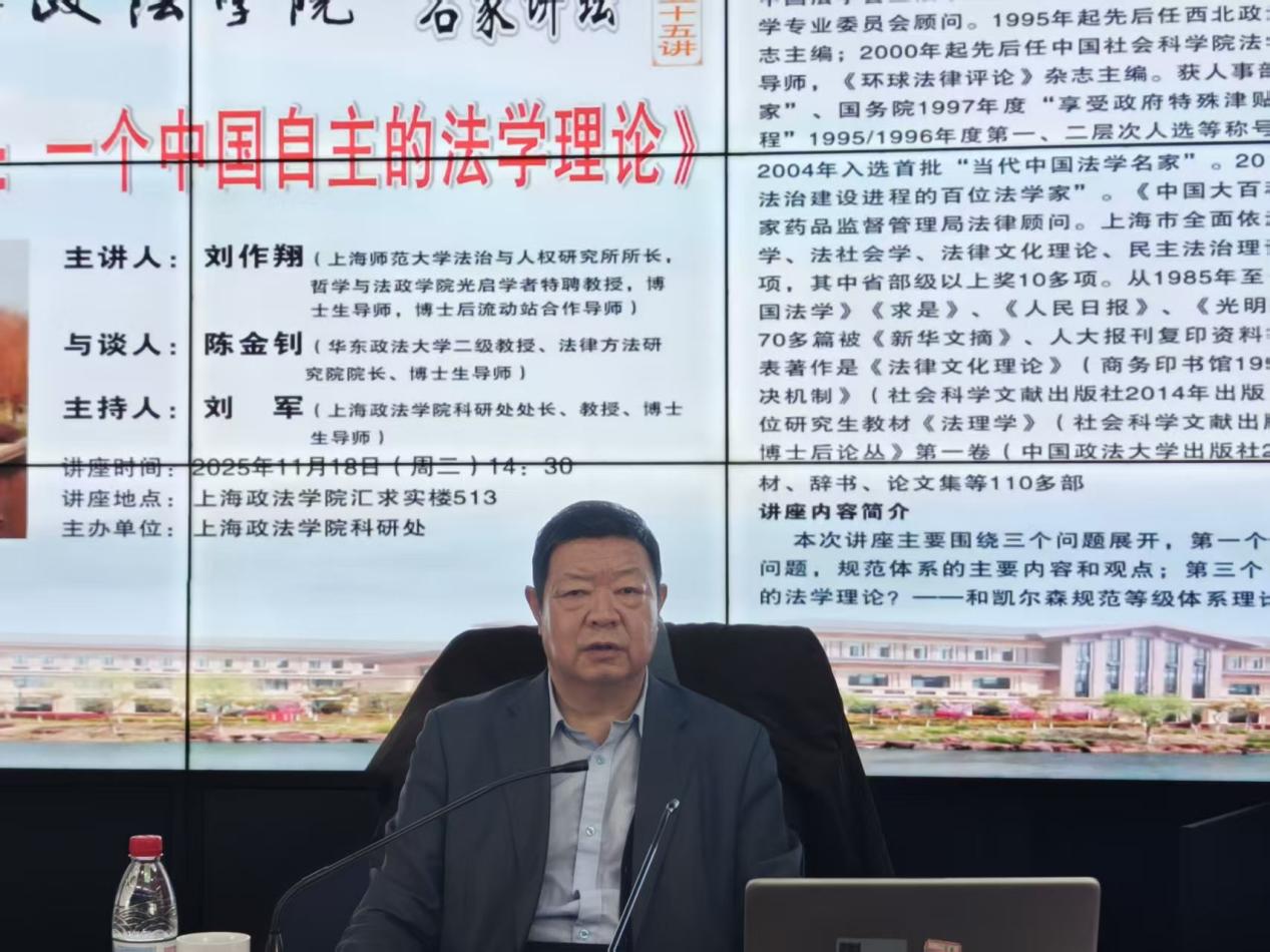 11月18日下午,新利18官方客服“名家讲坛”系列的第255讲在求实楼513会议室举办。上海师范大学法治与人权研究所所长,哲学与法政学院光启学者特聘教授,博士生导师,中国法学会法理学研究会副会长刘作翔教授以“规范体系:一个中国自主的法学理论”为题,为在场的师生们带来了一场引人入胜的学术演讲。讲座由新利18官方客服科研处处长刘军教授致辞并主持,华东政法大学陈金钊教授参与与谈。