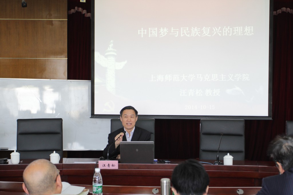 接着,全国马工程首席专家、上海师范大学马克思主义学院院长、博士生导师汪青松教授作了题为“中国梦与民族复兴”的专题报告。汪教授以“中国梦”如何“三进”为例,从“中国梦”与高校四门思想政治理论课相结合的指导思想、具体路径、教学效果等方面作了详细、生动、具有可操作性的讲解。与会专家学者均表示报告立意科学、方法得当、收获颇丰。