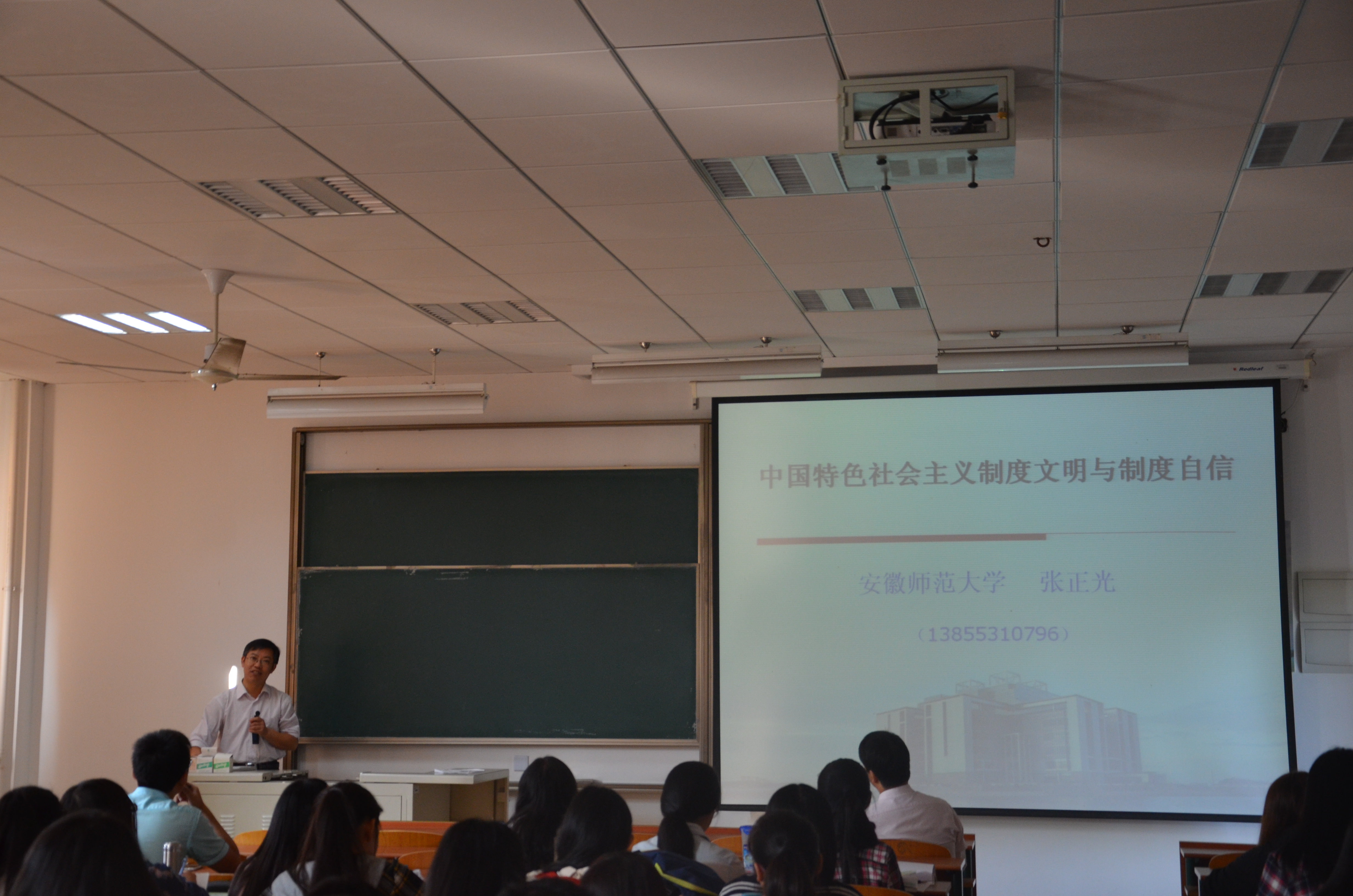 2014年10月23日上午,安徽师范大学博士生导师张正光教授做客我校马克思主义学院的“求是”论坛,为我校部分师生作了“中国特色社会主义制度文明与制度自信”的专题报告,讲座由马克思主义学院徐世甫副院长主持。此次学术讲座既是马克思主义学院“关于社会主义核心价值观‘三进’活动”的重要内容,又是马克思主义学院学术活动月的重要组成部分。