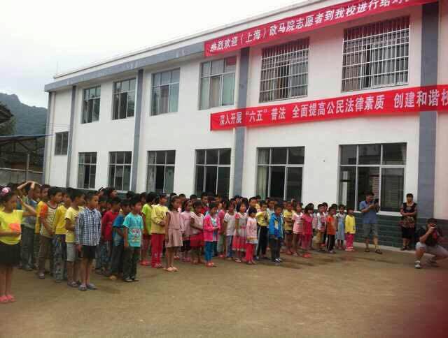 大雨过后的群山、万木焕然一新,志愿者们的热情也随之高涨。回龙小学校长亲自到校门口迎接志愿者队伍,待放置好行李物品后,隆重的活动启动仪式一切就绪。破旧的教学楼前挂着醒目的横幅——热烈欢迎上政马院志愿者与我校进行结对支教,可爱的小学生们站成整齐的方队等待着仪式的开始,马院志愿者队也站立在小学生方队旁边静候。回龙小学校长首先致辞,介绍了学校的基本情况,表达了对上政马院志愿者们的欢迎和感谢。接着由上政马院颜湘颖老师对本次活动的主要流程进行讲述,并表示将在活动中尽己所能地帮助每一位学生。最后由回龙小学校长宣布结对支教实践活动正式启动。