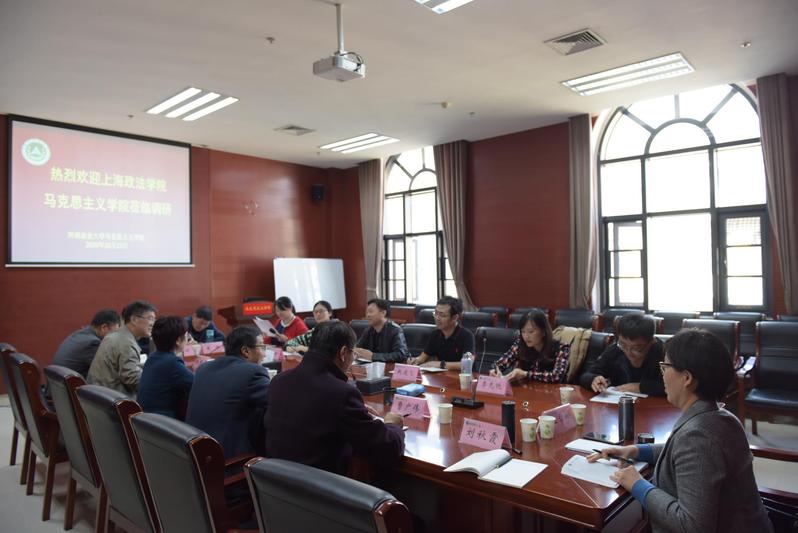 首先,河南农业大学马克思主义学院党总支书记马菲对我院一行表示欢迎,并简要介绍了马院的发展历程及基本建设情况。随后,河南农业大学马克思主义学院院长陈娱从学科建设、课程设计、成果取得等方面详细介绍了马院建设的主要经验,并围绕“五位一体教学模式”(即“修身”、“求是”、“鉴史”、“明理”、“笃行”),重点介绍了思政课教学的模式探索和特色找寻。