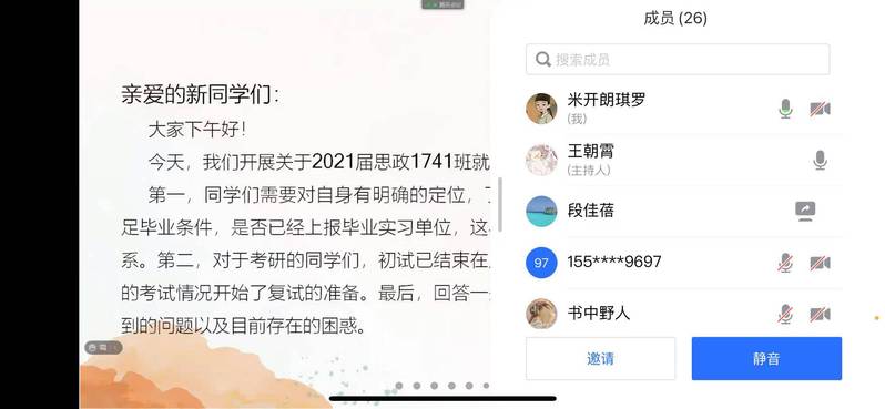 最后,段老师总结指出,做好马克思主义学院毕业生就业服务指导体系建设,形成完善的育人格局,优化就业结构,是马克思主义学院的重要工作内容。拓宽思政教育渠道,实现“线上线下”互通互享,构建多层次、立体化的网络思政格局是实现这一工作的重要途径。此次会议既是一次网络思政育人的全新尝试,又是一次促进我院毕业生就业、考研工作的重要实践,希望同学们寒假期间遵守疫情防控要求,做好职业规划,对接国家人才发展方针,承担起新时代赋予的的历史使命。(段佳蓓、牛艳宇撰稿)