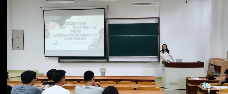 为加强马克思主义学院毕业生的职业生涯辅导规划,完善学院就业指导体系,增强学生对未来职业发展认知,立足思政专业特色,切实提升毕业生求职竞争力,7月9日下午,马克思主义学院于A8-101教室举办了2022届毕业生“扬帆——就业启航季”系列活动之2022届本科毕业生就业动员思政会议,会议由陈雅涵主持,本科生辅导员段佳蓓老师与学院全体2022届本科毕业生共同参加。