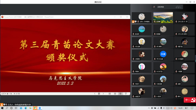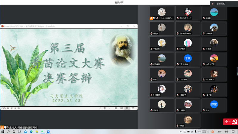 为深入学习贯彻落实习近平总书记重要讲话精神,全面推进马克思主义理论、党史学习教育以及优秀传统文化研究与课程实践,加强马克思主义理论学科人才培养、强化学科使命担当,鼓励学生在新时代的征程中立鸿鹄之志、发青年之声,5月3日,马克思主义学院于线上举办了第三届青苗论文大赛答辩及颁奖仪式,活动由孙伟超主持,马克思主义学院教师陈宝、时伟、范迎春担任大赛评委,学院党总支书记徐俊峰、副院长杨华及本科生辅导员段佳蓓出席活动。