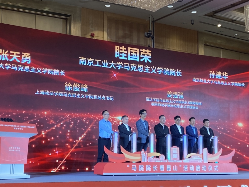 2023年11月9日,中共昆山市委员会、新华报业传媒集团主办,中共昆山市委宣传部、新华日报社苏州分社、新华日报社新华传媒智库承办“习近平新时代中国特色社会主义思想指引下的昆山实践”理论研讨会暨“江苏省习近平新时代中国特色社会主义思想研究中心昆山市实践调研基地”揭牌仪式顺利召开。马克思主义学院党总支书记徐俊峰教授、习近平新时代中国特色社会主义思想概论教研室主任时伟副教授应邀参加本次会议。