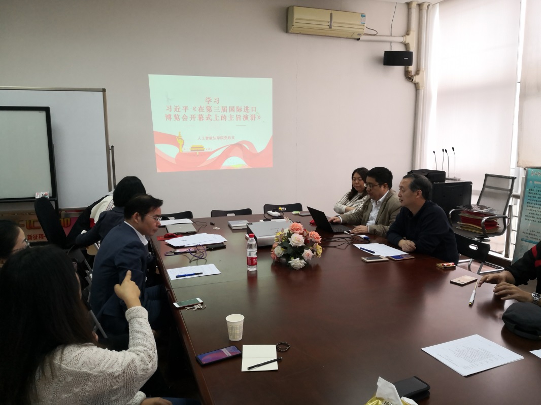 云太真和景国强两位同志先后带领大家学习习近平总书记《在第三届国际进口博览会开幕式上的主旨演讲》和《向第三届世界顶尖科学家论坛的致辞》。随后,与会同志展开了学习体会,大家认为,习近平总书记向展示了中国实施更深层次、更宽领域和更广大范围对外开放的坚定决心,表达高度重视科技创新工作,坚持把创新作为引领发展第一动力的执政理念,十分鼓舞人心。大家表示,科学研究包括人工智能的研究,要遵从伦理原则和人类利益原则,人工智能法学领域的研究必须加强对外交流和国际合作。