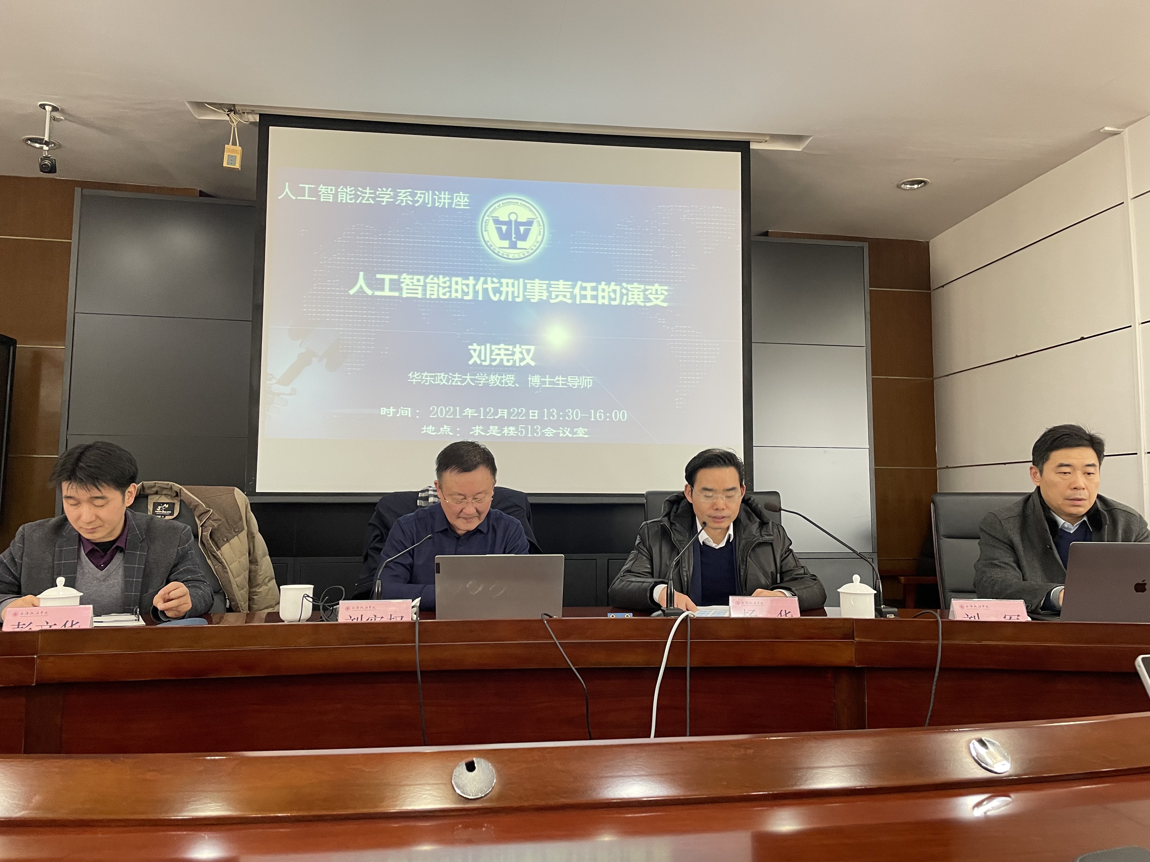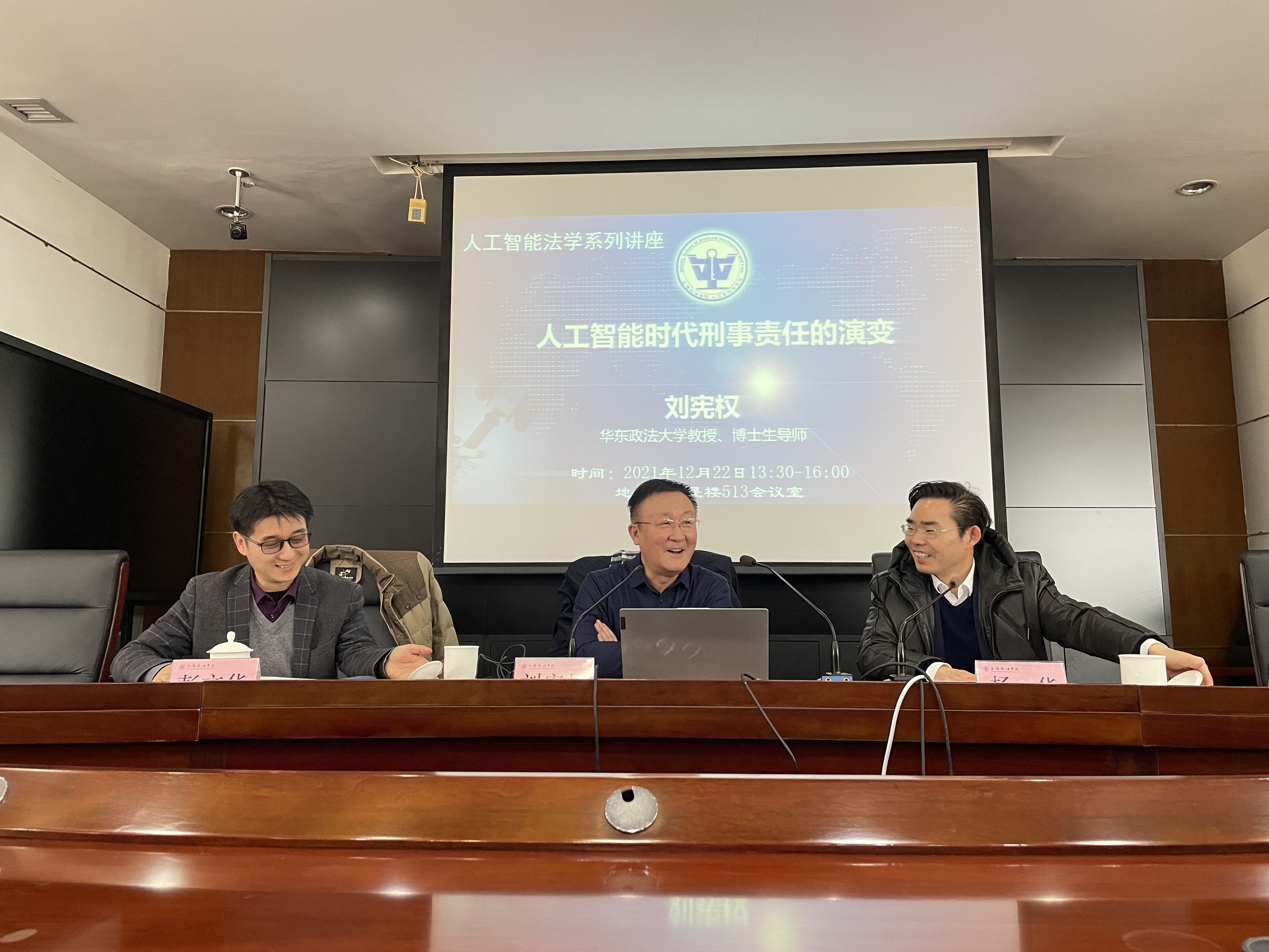 12月22日下午,新利18官方客服人工智能法学院邀请到了华东政法大学教授、全国劳动模范刘宪权老师来到求实楼513开展讲座。由新利18官方客服人工智能法学院院长杨华主持,新利18官方客服刑事司法学院彭文化和刘军两位教授作为与谈人,四位教授围绕“人工智能时代刑事责任的演变”这一话题进行了亲切友好的交流与探讨。