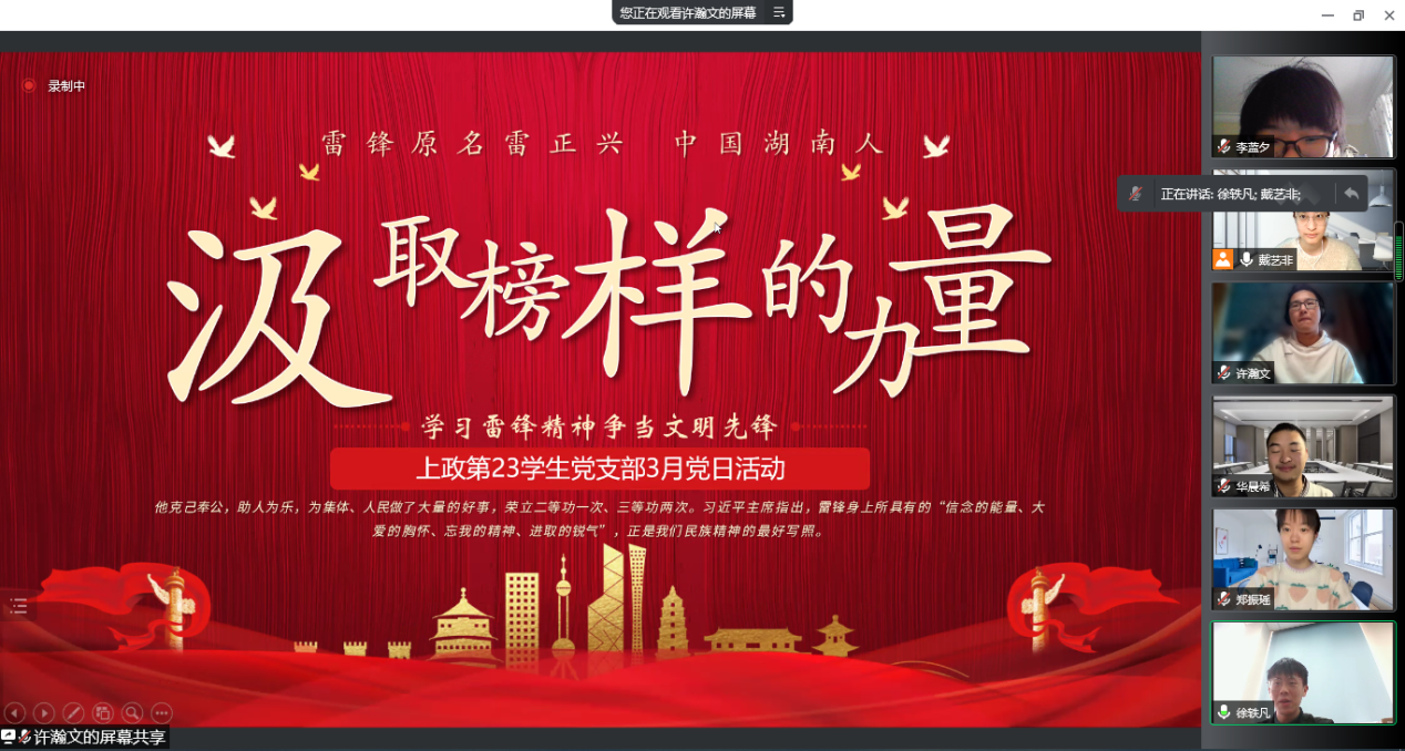 3月22日,上政第23学生党支部于线上举行了“学习雷锋精神、汲取榜样力量”主题党日活动。党支部书记徐轶凡同志主持,全体学生党员参与。