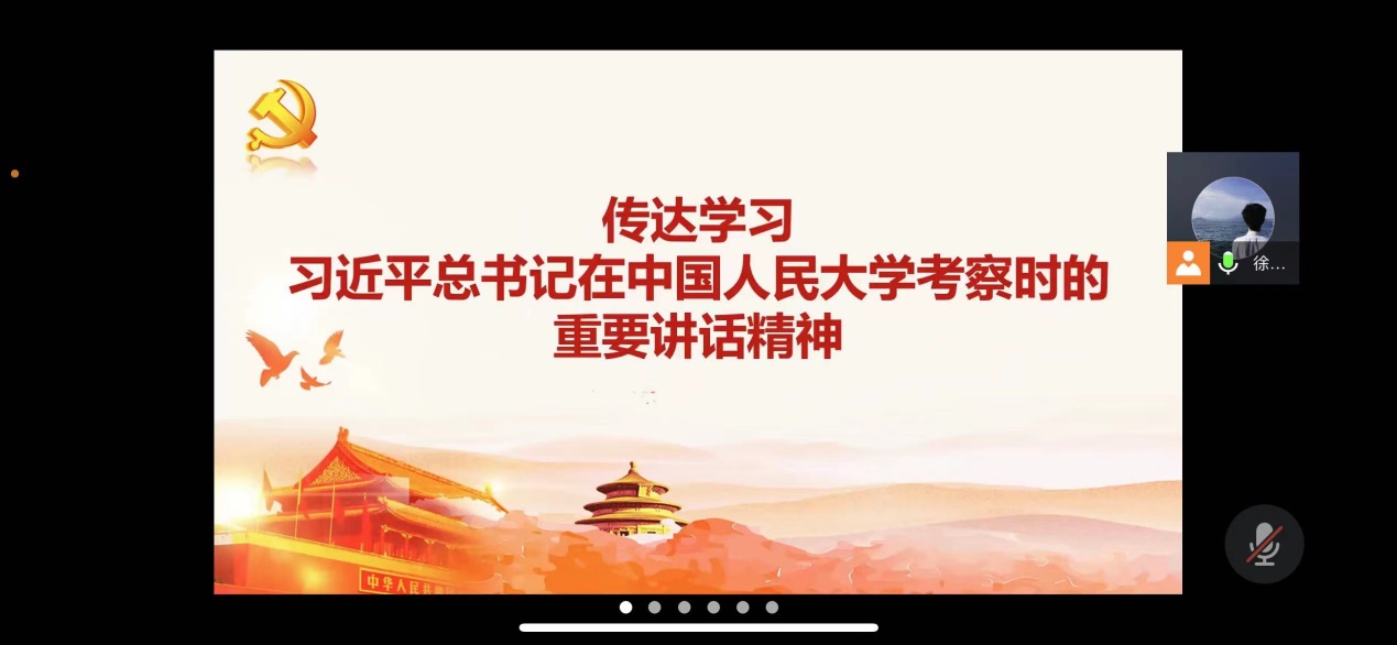 会议首先传达学习了习近平总书记在中国人民大学考察时的重要讲话精神,支部党员围绕学习体会进行了书面和口头交流。与会学生党员纷纷表示,要按照习近平总书记对青年的殷切嘱托,做到真学、真懂、真用,要将学习成果转化为打赢疫情防控大仗硬仗的强大动力,在当前校园疫情防控工作中发挥模范带头作用,带头配合执行学校各项防疫措施,用行动和担当擦亮党员名片,不负韶华,不负时代,不负人民,以民族复兴为志,在青春的赛道上跑出当代青年的最好成绩!