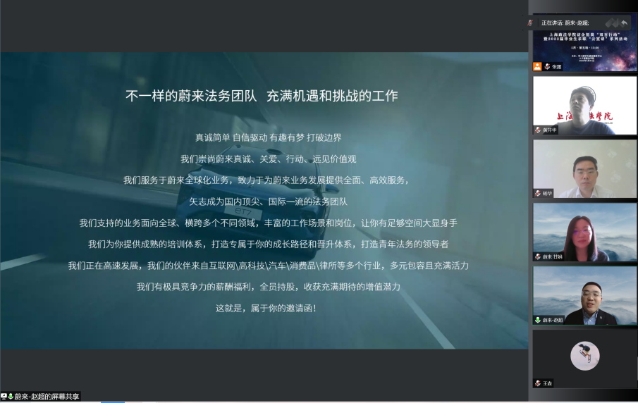 5月31日下午,由校学工部就业中心、人工智能法学院共同主办的访企拓岗促就业“双百行动”暨2022届毕业生求职“云宣讲”第五场顺利举行,邀请上海蔚来汽车法务部负责人进行主题宣讲。人工智能法学院院长杨华、党总支副书记彭辉、副院长黄芹华,学工部就业服务中心主任张宏辉出席。人工智能法学院全体本科生、研究生120余人参加宣讲。宣讲活动由学工部就业服务中心张露主持。