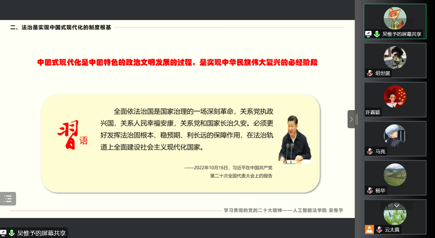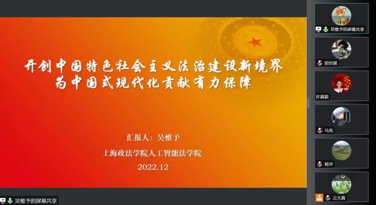 12月27日,人工智能法学院召开学习宣讲党的二十大精神专题宣讲,我院吴惟予老师作了题为“开创中国特色社会主义法治建设新境界,为中国式现代化贡献有力保障”的宣讲报告。党总支书记彭辉、院长杨华、副院长黄芹华等学院教工以及全体学生党员参加了活动。
