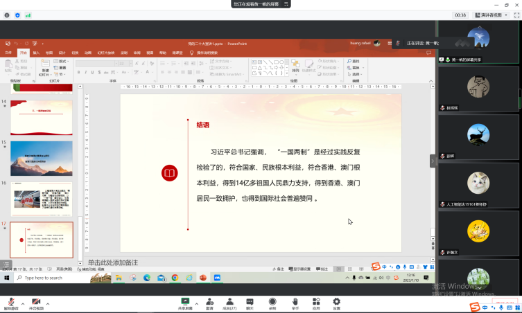 宣讲结束后,学院党总支书记彭辉表示,黄一帆老师的宣讲报告内涵丰富,让大家对“一国两制”政策有了更进一步的认识,港澳地区在中国经济发展过程中起到重要作用,其治理模式将在未来台湾回归中提供成功经验。副院长黄芹华表示,黄一帆老师的宣讲主题深刻,后续余圣琪老师的总结和彭辉书记的点评让人收获颇丰。