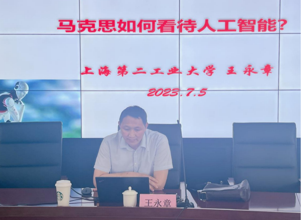 为推动主题教育走深走实,进一步落实联组学习、联手调研、联动整改、联推发展的“四联”工作机制,7月5日下午,信息化工作办公室党支部与中国电信上海公共服务大客户部党支部、上政第23学生党支部在求实楼513会议室开展共建支部联组学习。上海第二工业大学马克思主义学院院长王永章教授受邀作“马克思如何看待人工智能?”专题讲座,上海电信公共服务大客户部行业总监赵惠璇,人工智能法学院党总支书记彭辉、院长杨华、学工负责人印晓慧,各支部党员以及学生党员代表参加。学习会由信息化工作办公室党支部书记倪宇斌主持。