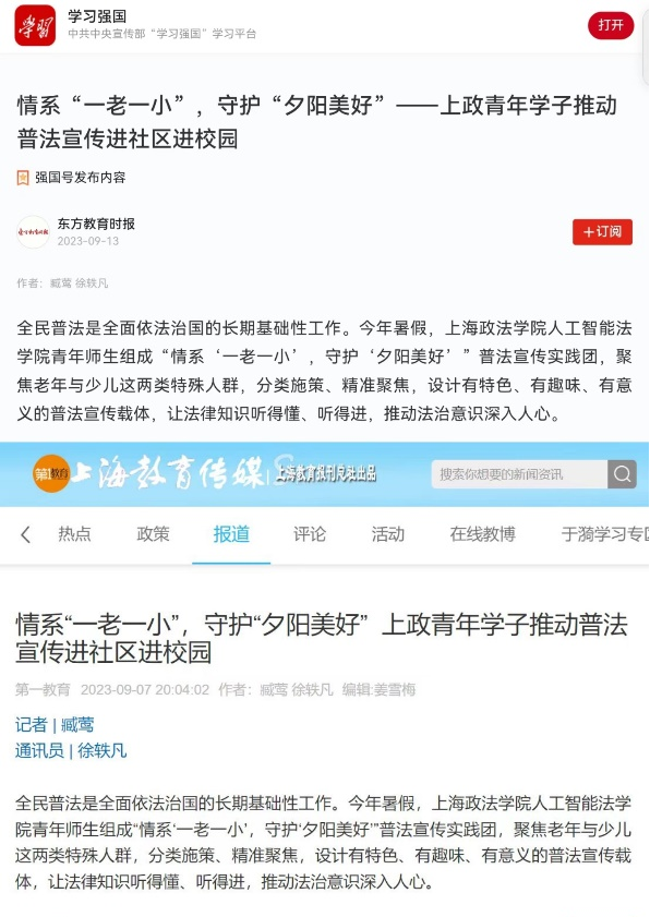 今年暑假,我院青年师生组成“情系‘一老一小’,守护‘夕阳美好’”普法宣传社会实践被学习强国、第一教育、新闻晨报、中国青年网等多家媒体平台报道。