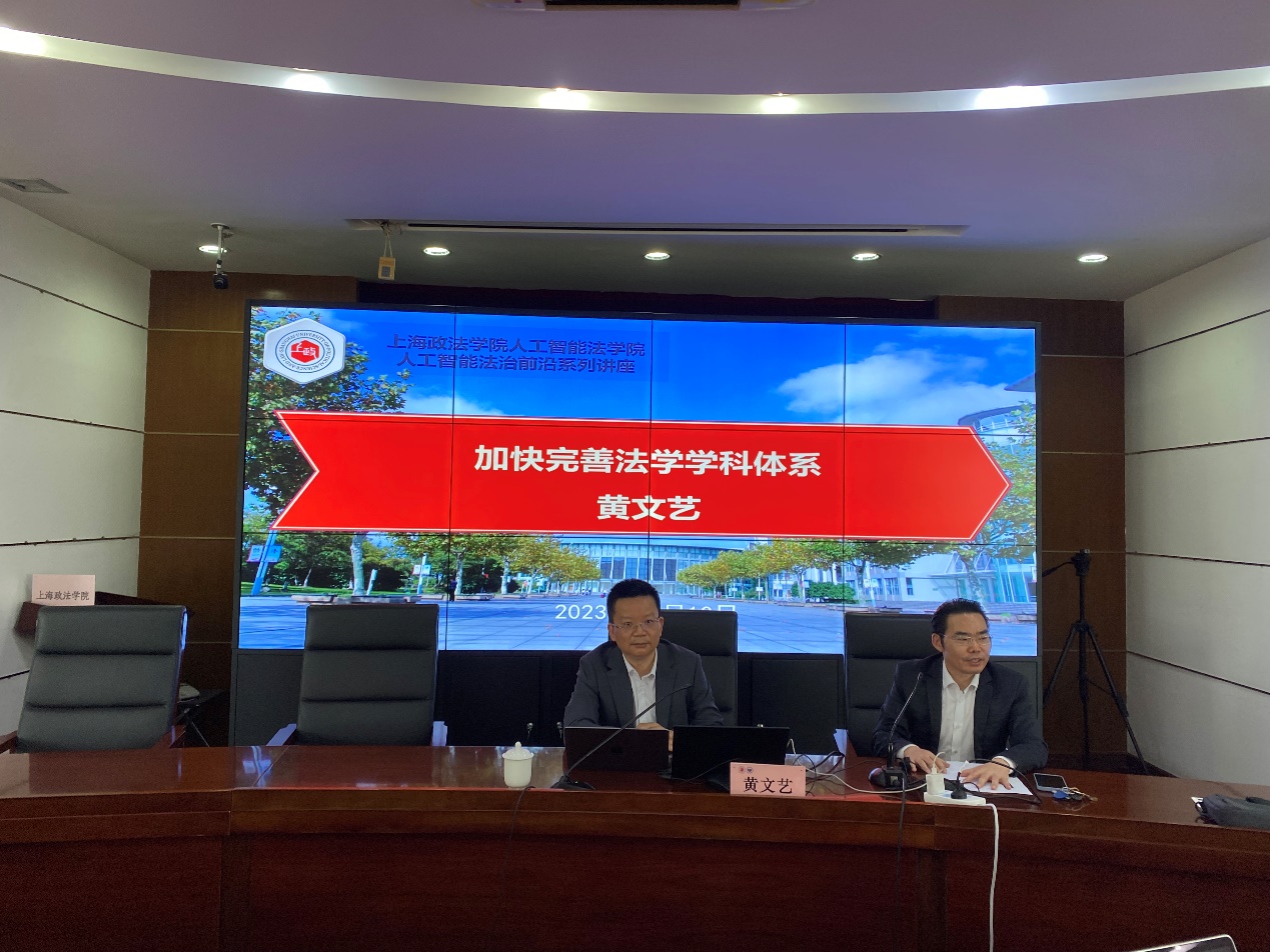 2023年10月10日下午,由人工智能法学院主办的“人工智能法治前沿系列讲座”2023-2024学年秋季学期第一讲顺利举办。本次讲座主讲嘉宾为教育部高等学校法学学科教学指导委员会委员、教育部长江学者特聘教授、《中国法学》总主编、中国人民大学法学院院长、教授黄文艺,讲座主题为“加快完善法学学科体系”。讲座由人工智能法学院院长、教授杨华主持,科研处处长刘军教授、刑事司法学院院长彭文华教授、国际法学院特聘院长徐国健教授、人工智能法学院党总支书记彭辉,以及上述学院、上海司法研究所等单位十余名教师代表到场,近百名师生参加了本次讲座。