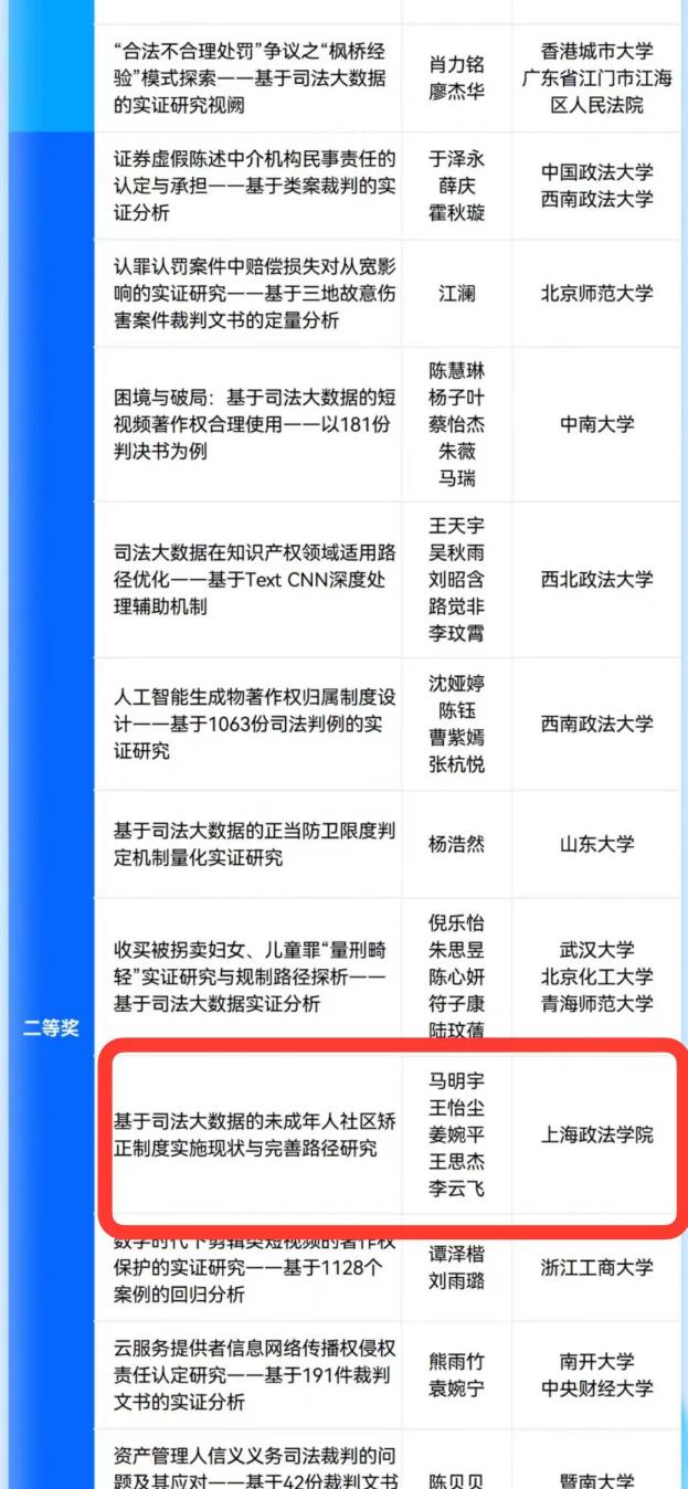 2024年1月31日,由最高人民法院信息中心指导、中国司法大数据研究院主办的第二届“法研灯塔”司法大数据征文比赛正式落下帷幕。由警务学院翟一鸣老师、人工智能法学院鲍坤老师指导,警务学院学生马明宇担任组长并与人工智能法学院王怡尘、王思杰、李云飞,法律学院姜婉平共同撰写的论文《基于司法大数据的未成年人社