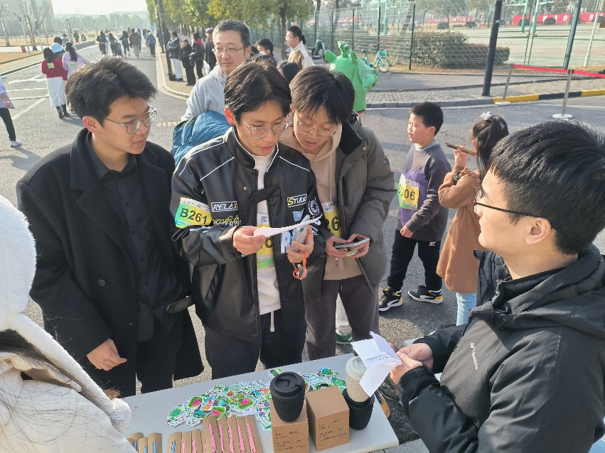 活动现场热闹非凡,参与人员除大学生跑者外,教职工家庭、多个学院团体也来到活动现场,齐心协力携手体验低碳生活和了解生态法治理念。