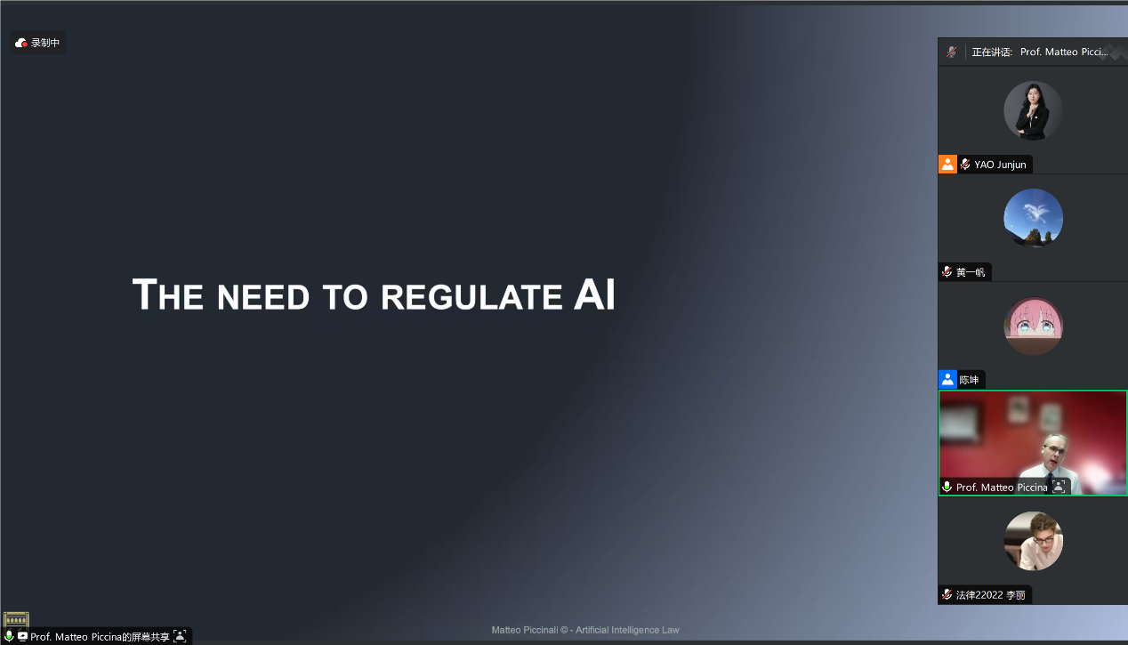 Matteo Piccinali教授以欧盟最新颁布的《欧盟人工智能法案》(EU AI ACT)为切入点开启了本次讲座,探讨了现存的不断增长的人工智能法律安全问题以及欧盟在立法层面的应对方案。Matteo Piccinali教授较为详尽地介绍了人工智能的发展历程,通过最新的视频生成式人工智能大模型Sora以及具体的欧盟人工智能法案法条阐述规制人工智能的逻辑与方法。随后,Matteo Piccinali教授深入讲解了欧盟的人工智能法案对大模型的风险规制框架。最后,Matteo Piccinali教授对欧盟如何规制人工智能产生的法律和社会问题进行了总结。