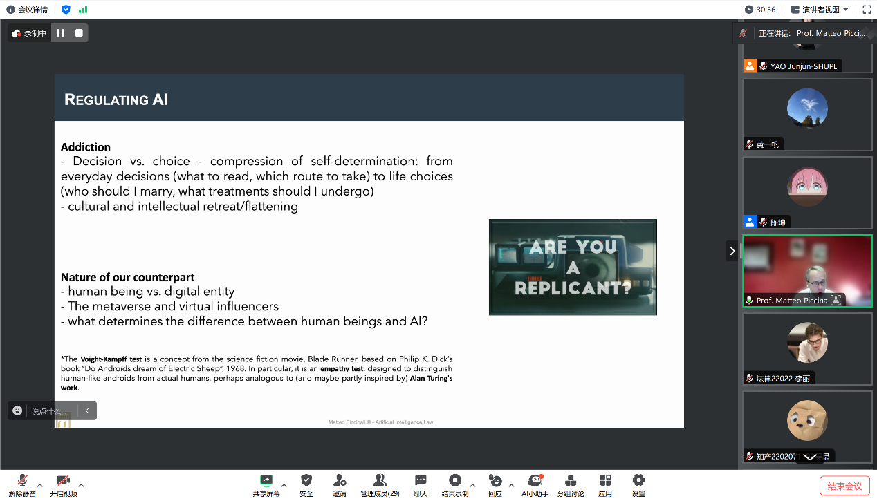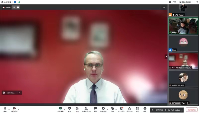 在互动交流环节中,Matteo Piccinali教授就与会同学对每学年秋季学期的英文课程“中意法律诊所”以及相关交流项目等问题进行了解答,并与参加本次“海外讲坛”在线讲座的师生就人工智能所引发的一系列社会与法律问题展开了友好交流和互动,现场气氛活跃。
